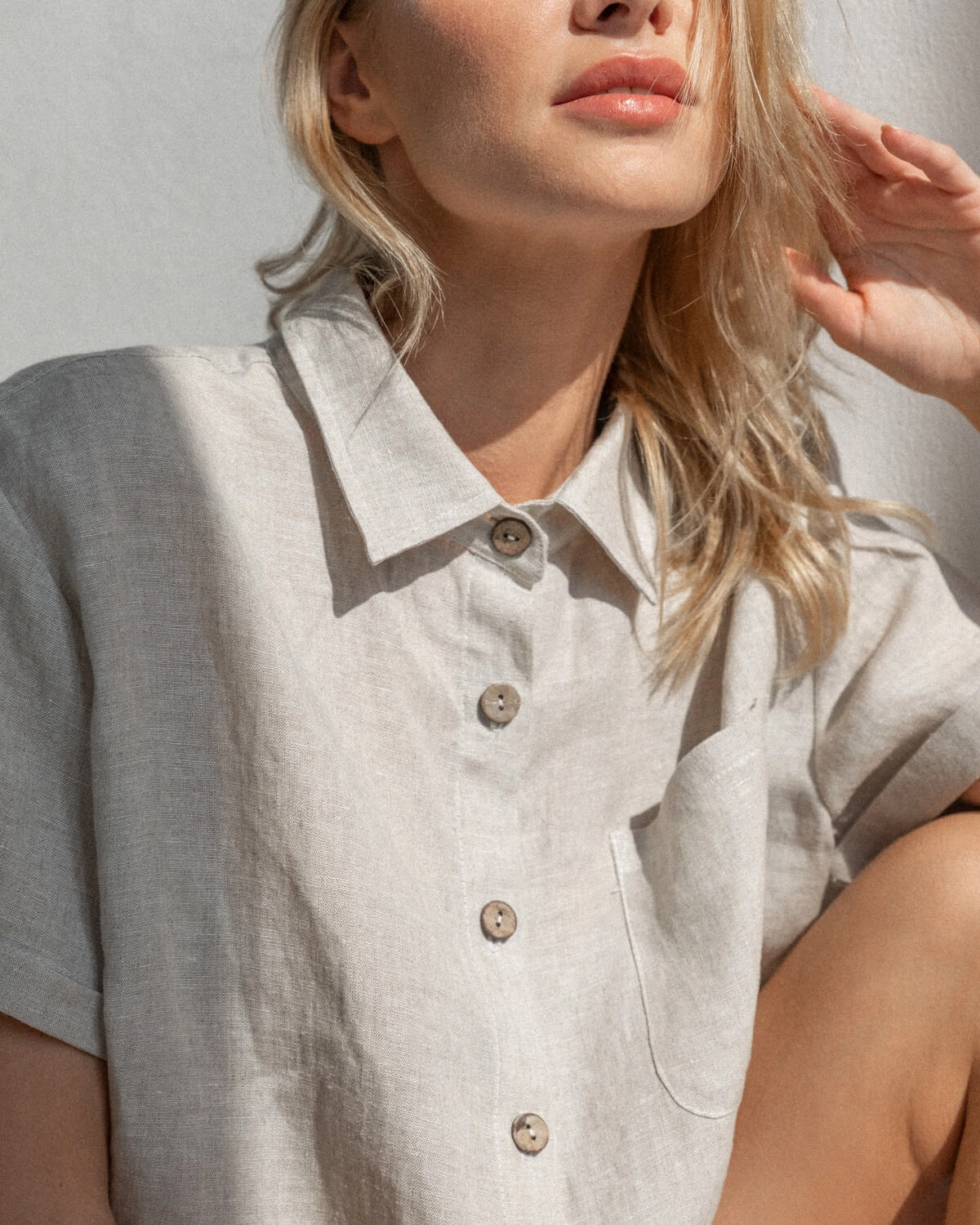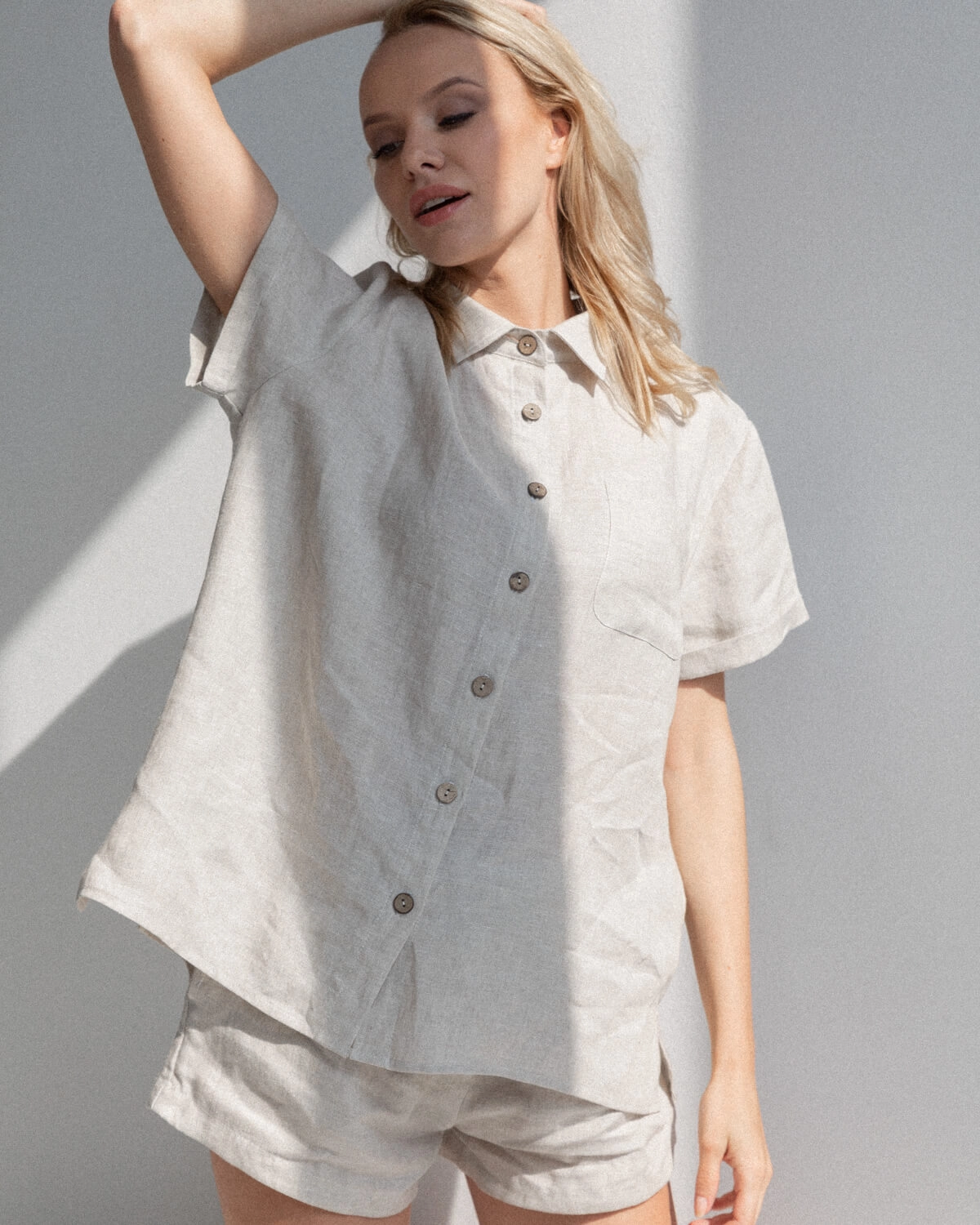 Lniana koszula z krótkim rękawkiem. Idealna na co dzień lub do spania w połączeniu z naszymi krótkimi spodenkami. Koszula uszyta jest z miękkiego lnu, posiada guziki kokosowe,