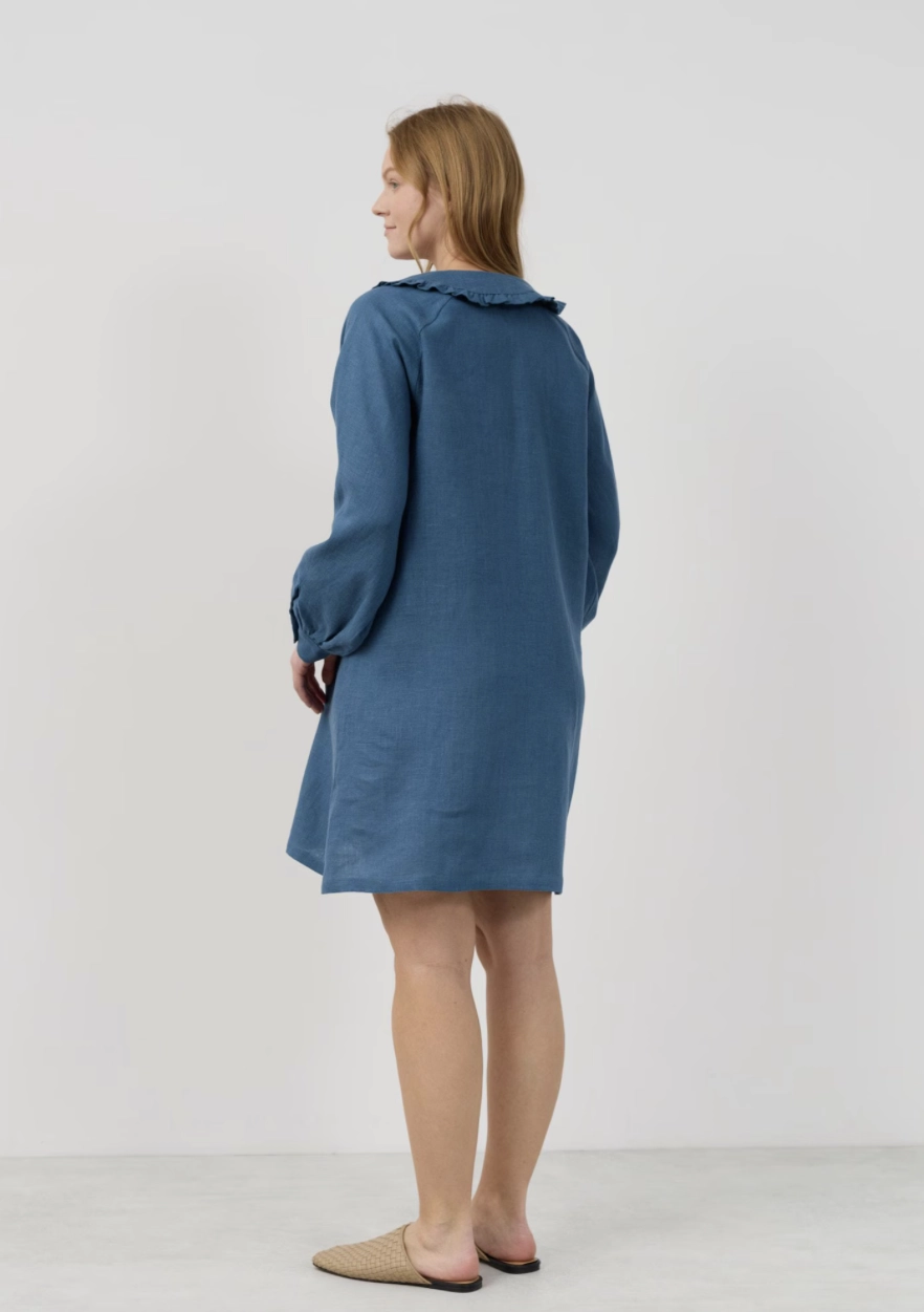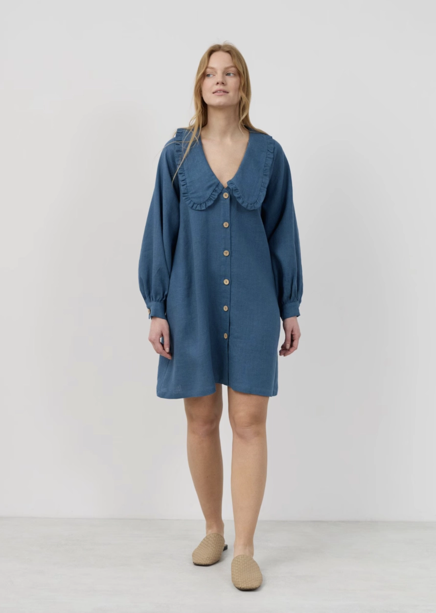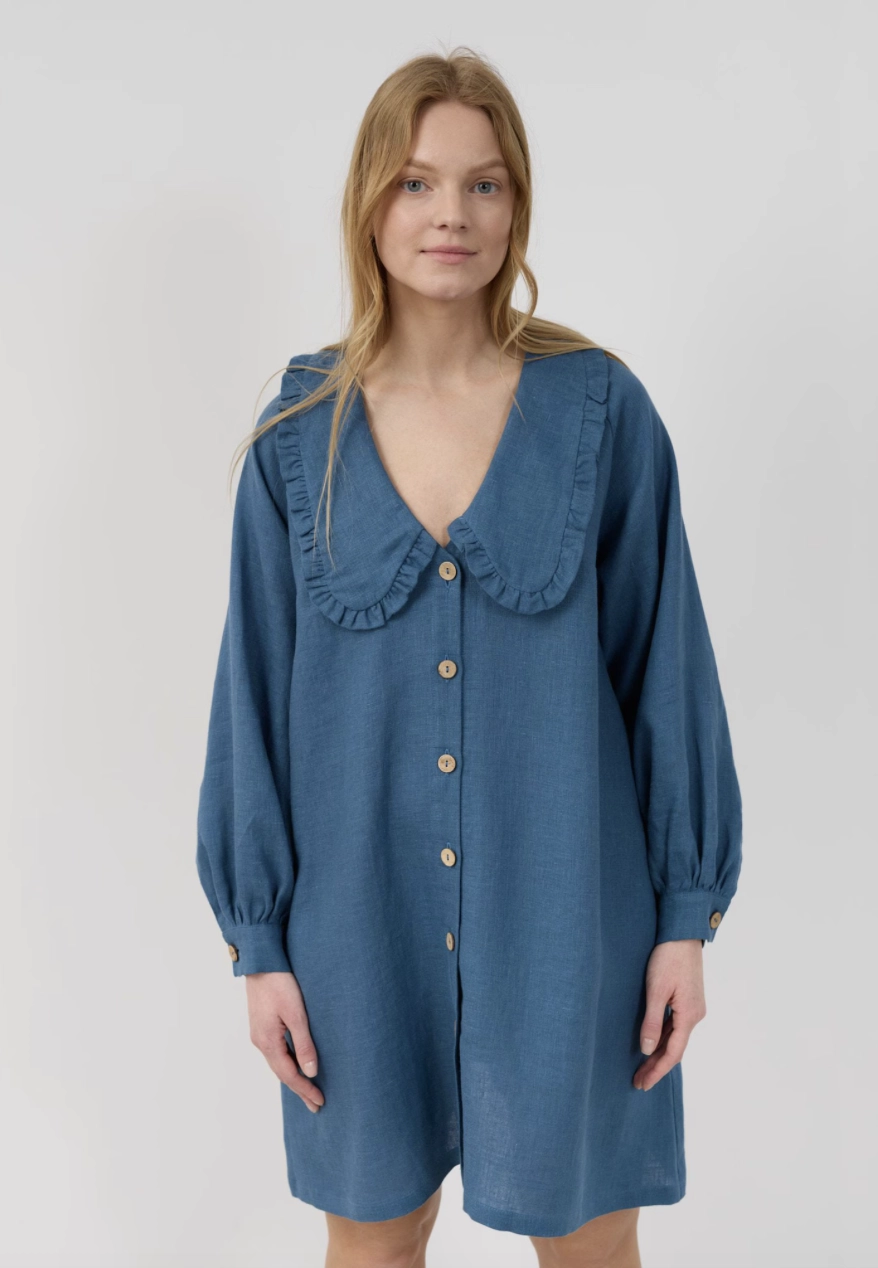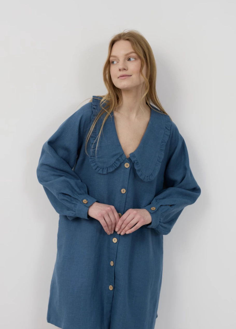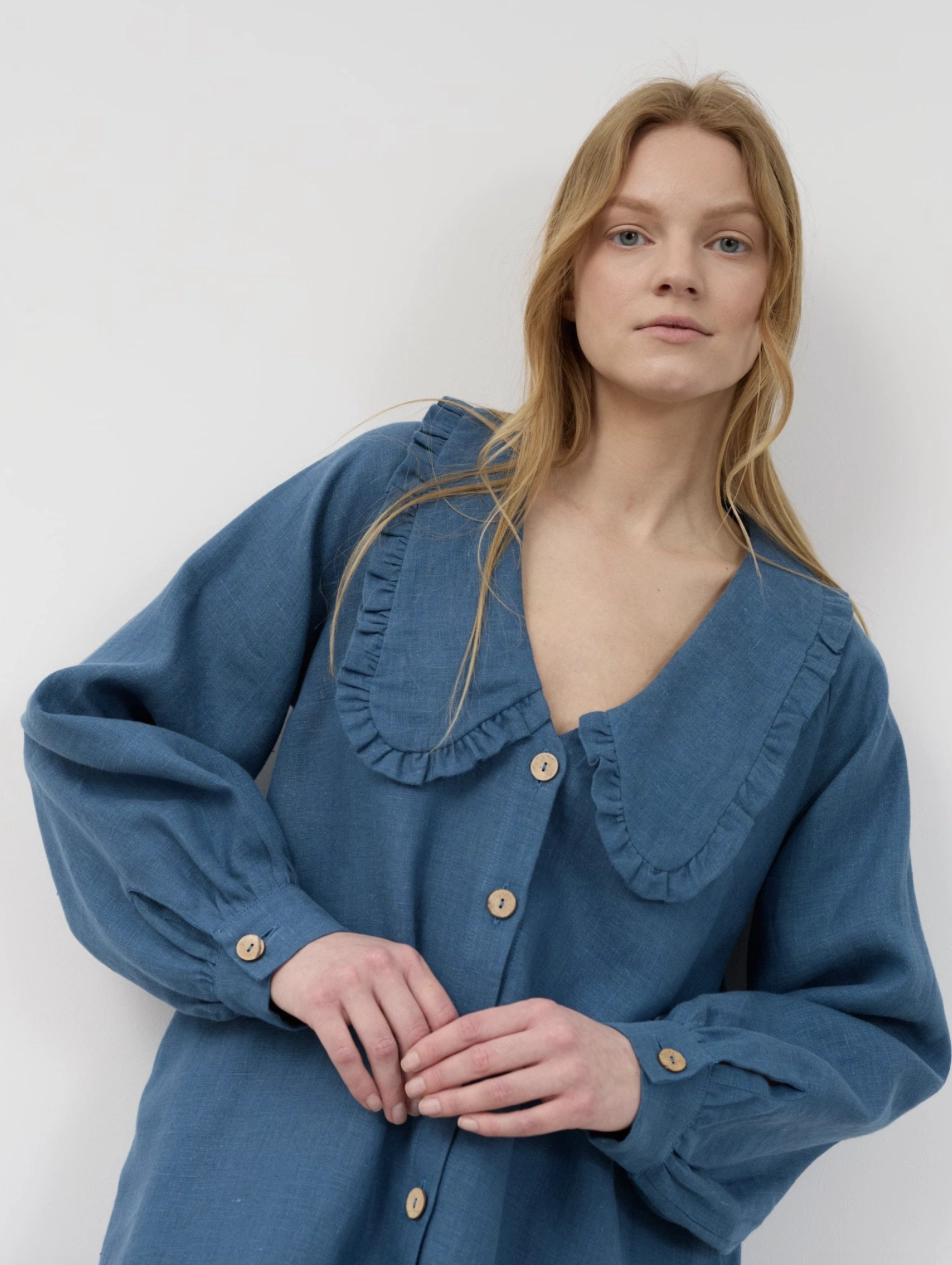 Subtelna i kobieca, z delikatnym ukłonem w stronę stylu retro. „Niebieski Poranek” to lniana sukienka o prostym kroju, która zachwyca detalami: bufiastymi rękawami, naturalnymi guzikami oraz szerokim, falowanym kołnierzem w stylu babydoll.