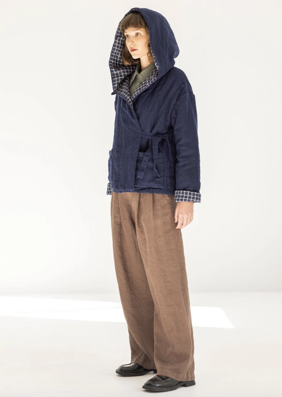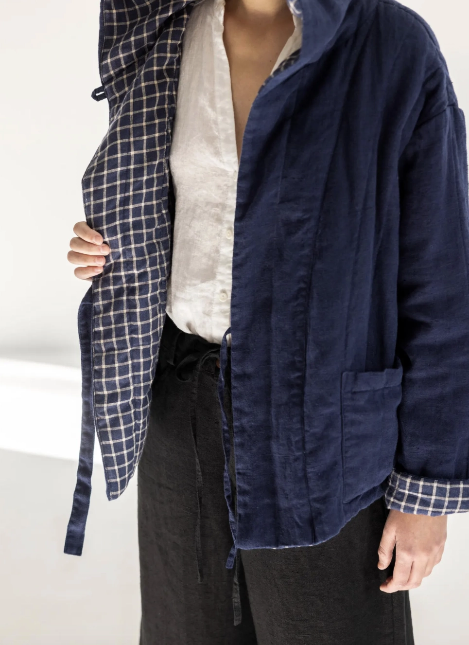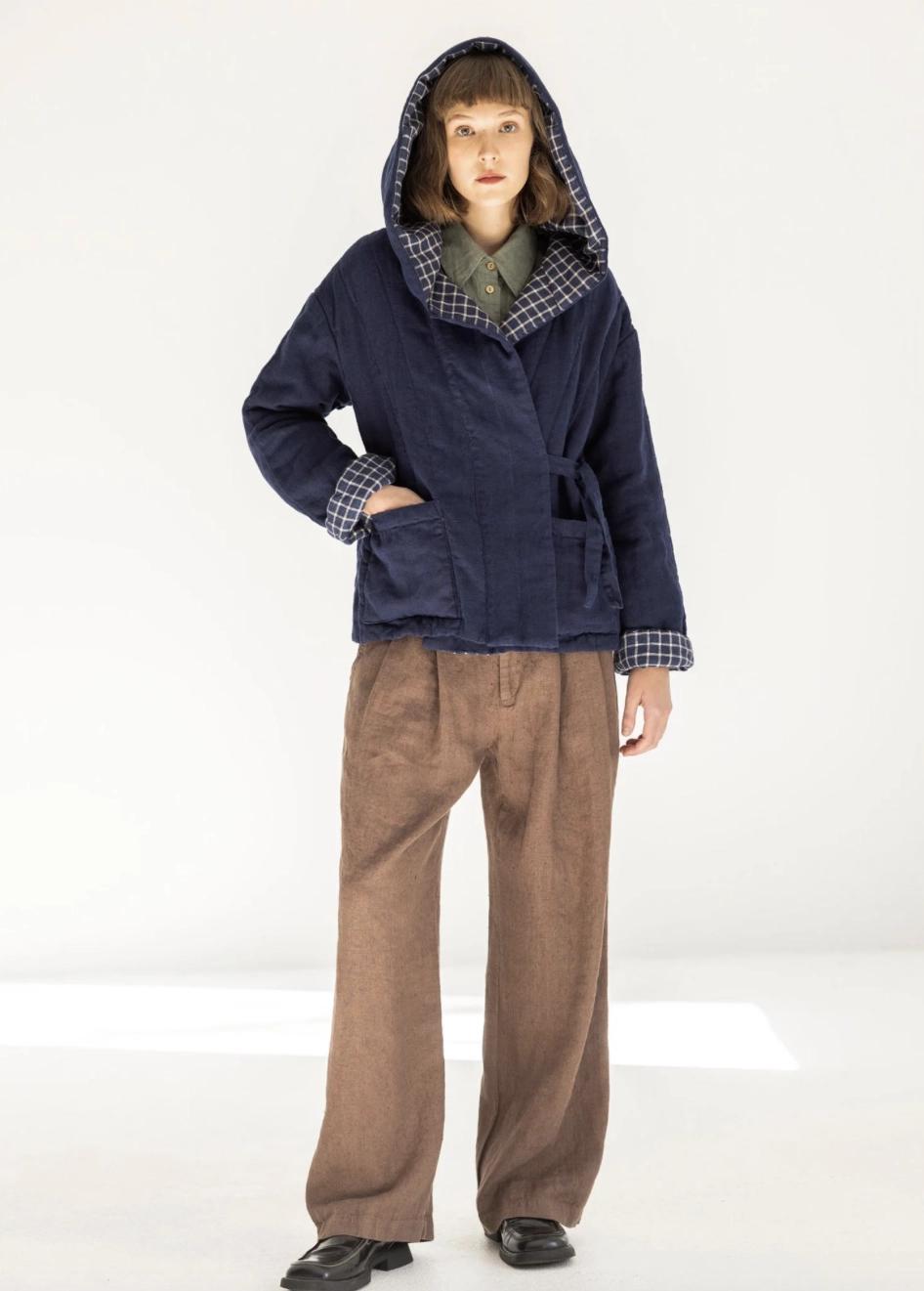 Zanurz się w miękkości, cieple i eleganckiej funkcjonalności z naszą pikowaną lnianą kurtką z kapturem, Dzięki kapturowi, wiązaniu w stylu kimona i kontrastowej, dwustronnej konstrukcji, ta kurtka to idealny wybór na chłodniejsze dni.