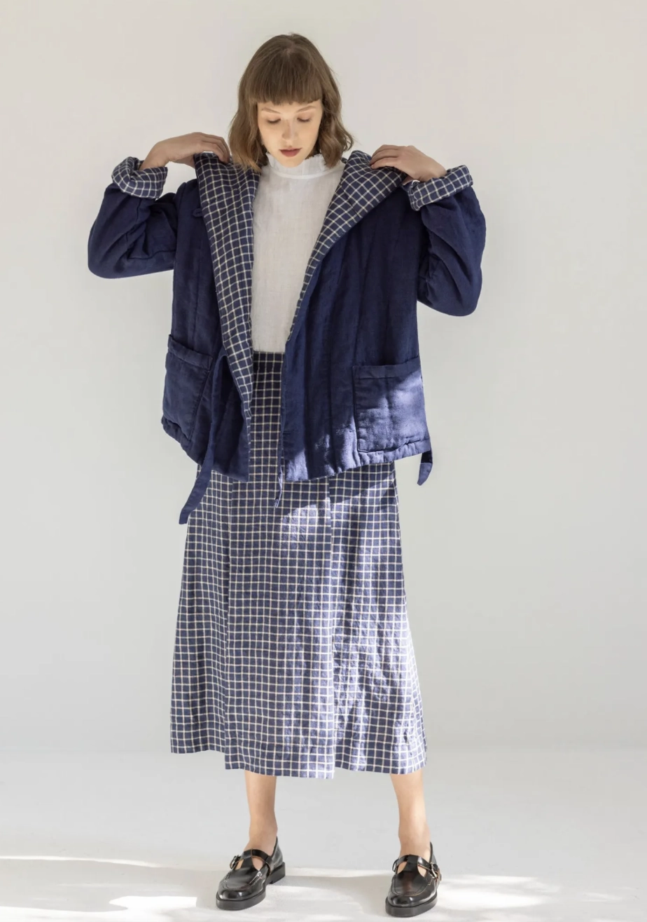 Dwustronna Pikowana Kurtka z Lnu z Kapturem – Evening Blue
