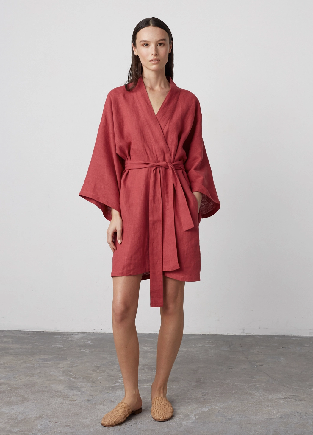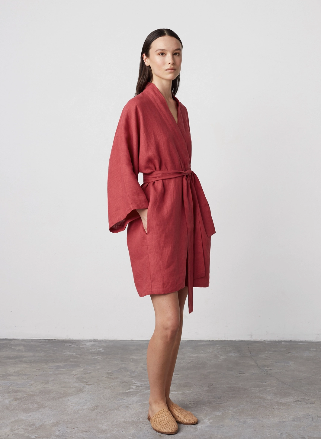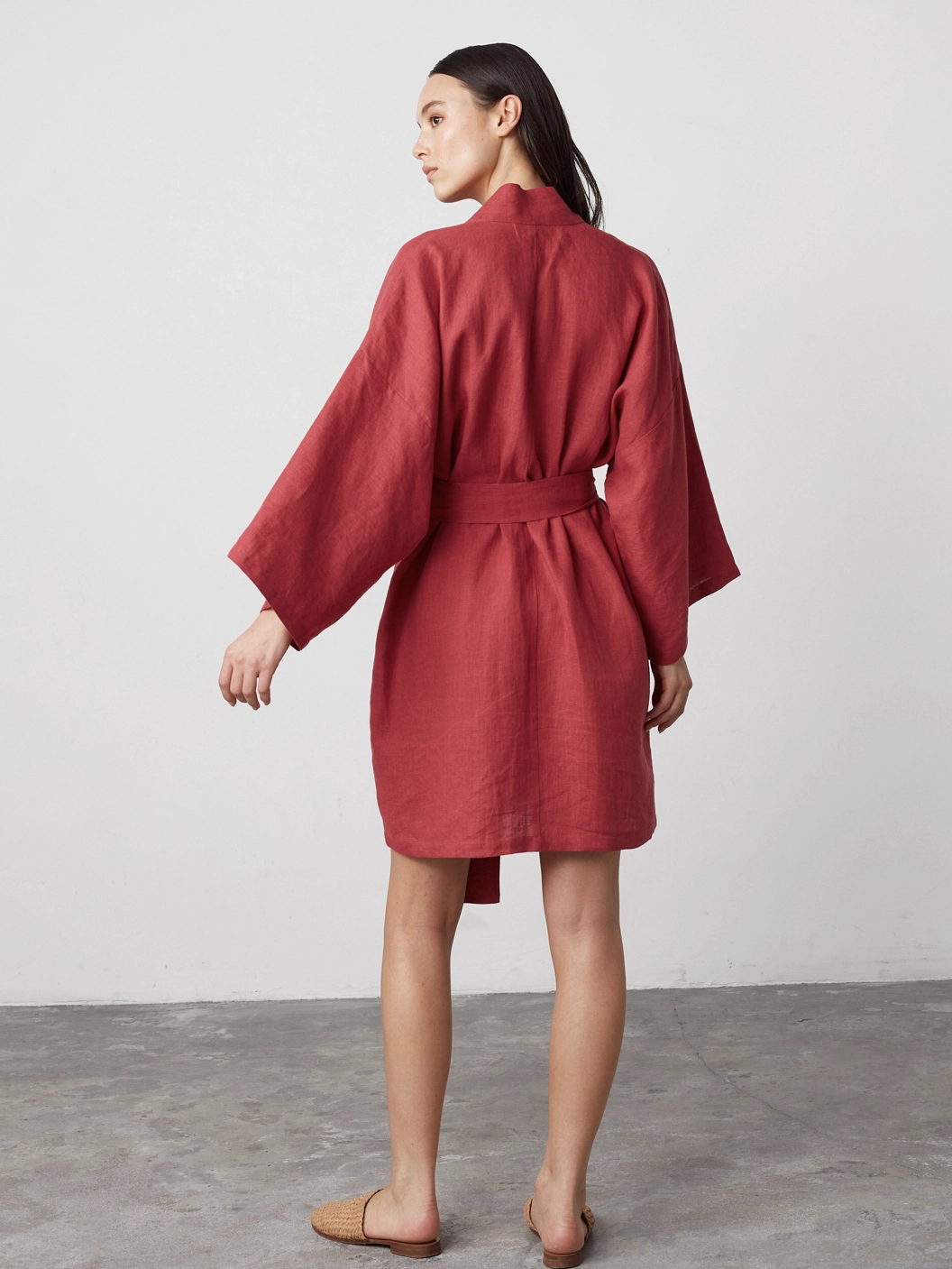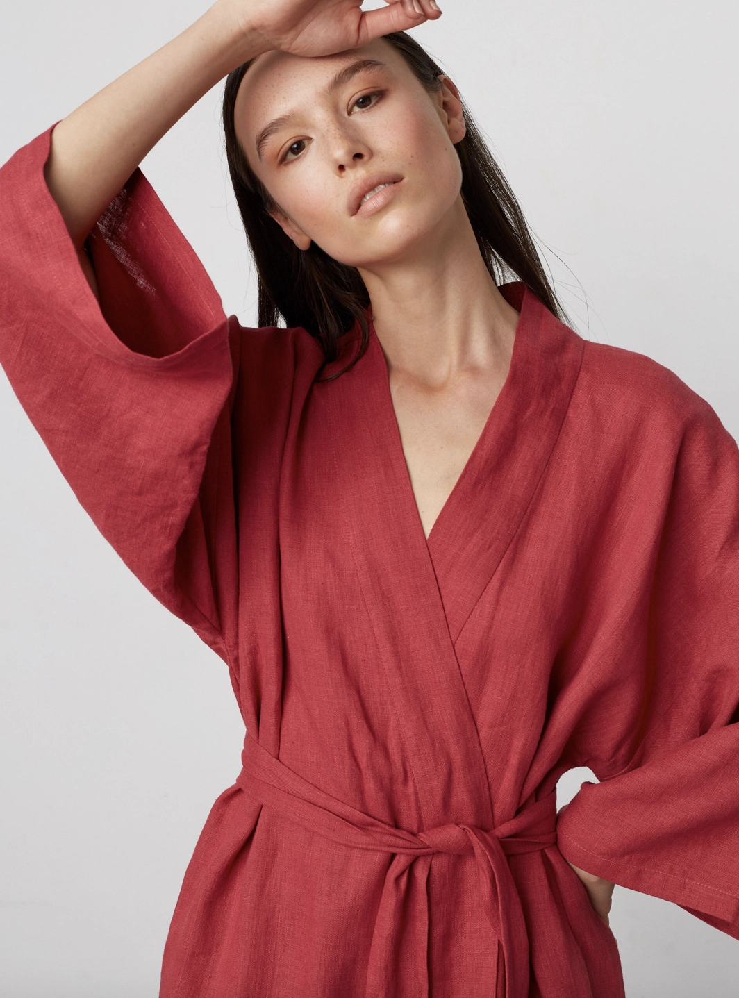 Szerokie rękawy inspirowane japońskim kimonem oraz wiązanie w talii nadają jej eleganckiego, ale swobodnego charakteru. Głęboki odcień terakoty dodaje ciepła i głębi, idealnie komponując się z naturalnymi dodatkami.