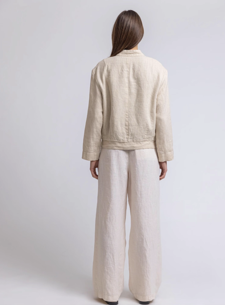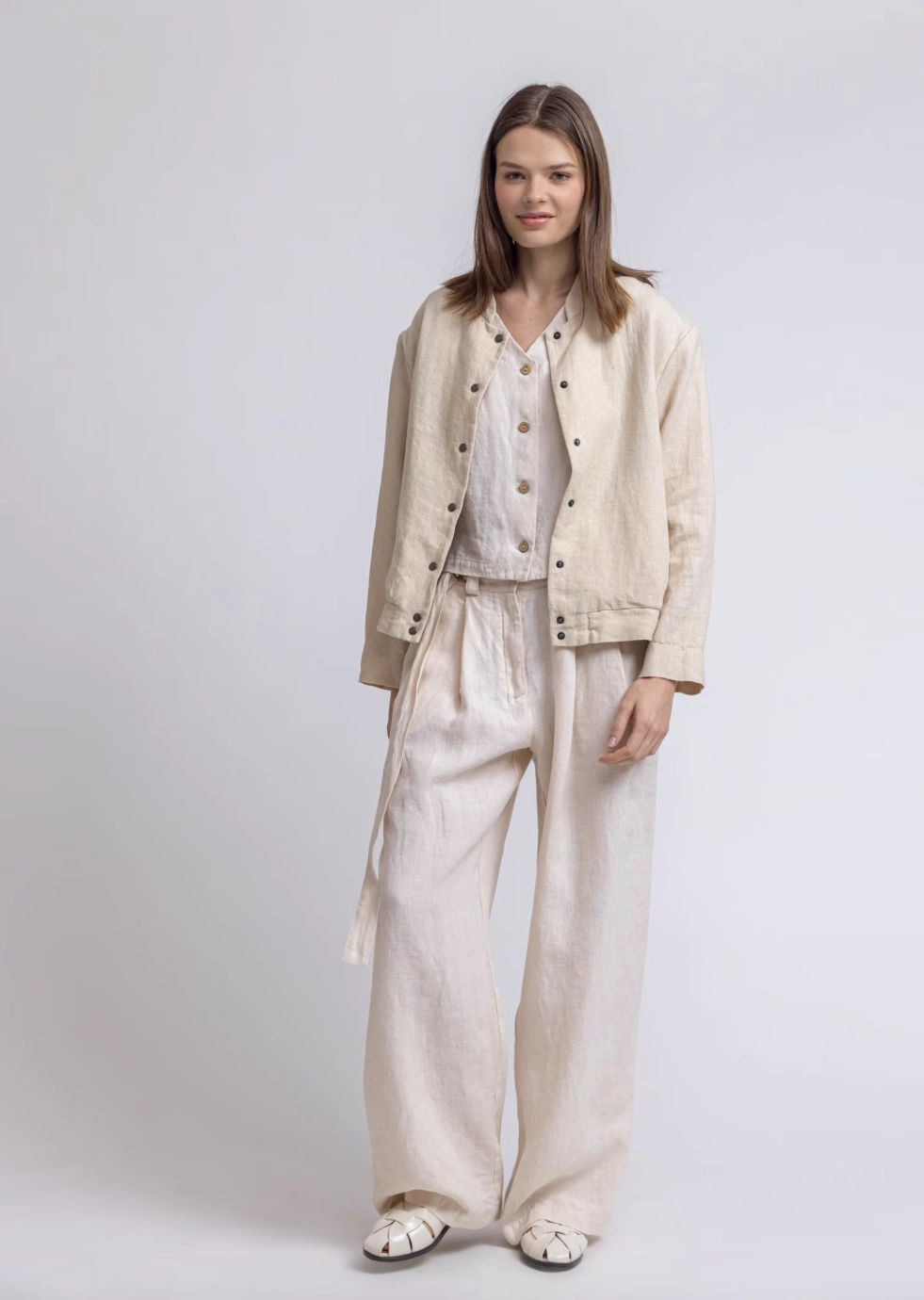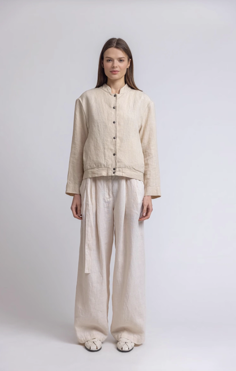 Idealna na przejściowe pory roku i chłodniejsze letnie wieczory, ta lniana bomberka to uniwersalny element garderoby, który łatwo zestawisz z różnymi stylizacjami.