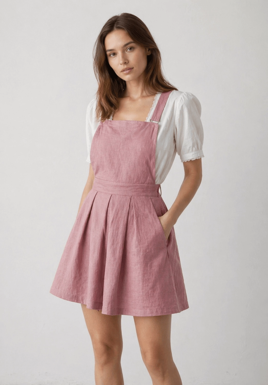 Romantyczna i ponadczasowa sukienka ogrodniczka wykonana w 100% z wysokiej jakości lnu, idealna na letnie dni. Łączy w sobie rustykalny urok i nowoczesny komfort.