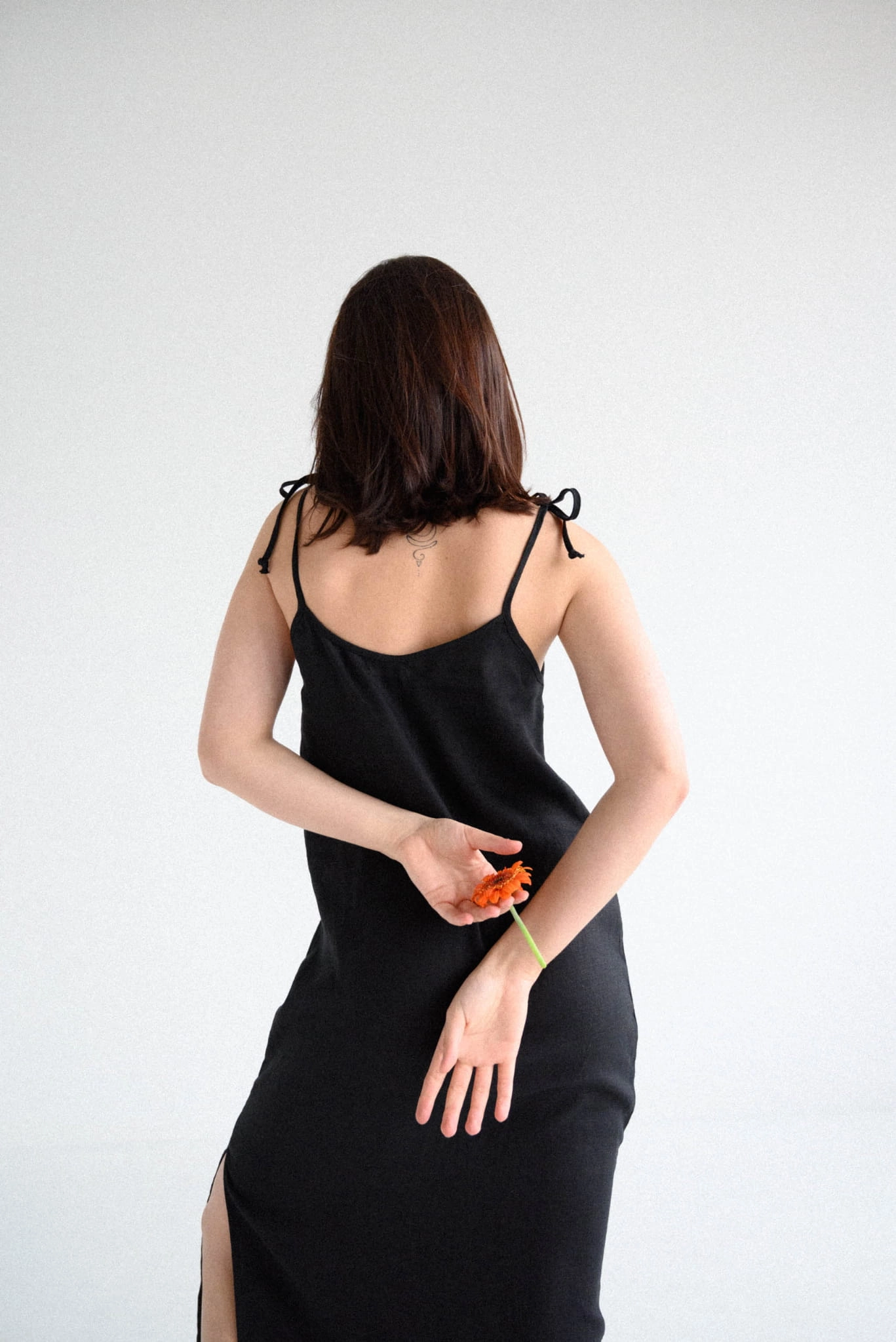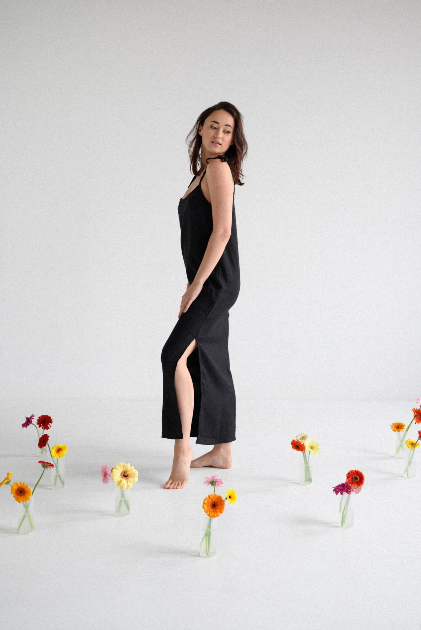 Sukienka lniana na wiązanych ramiączkach typu slip dress. Klasyczny model. Ramiączka mają około 50 cm długości. Idealna na co dzień, czy do spania. Modelka ma na sobie rozmiar S.