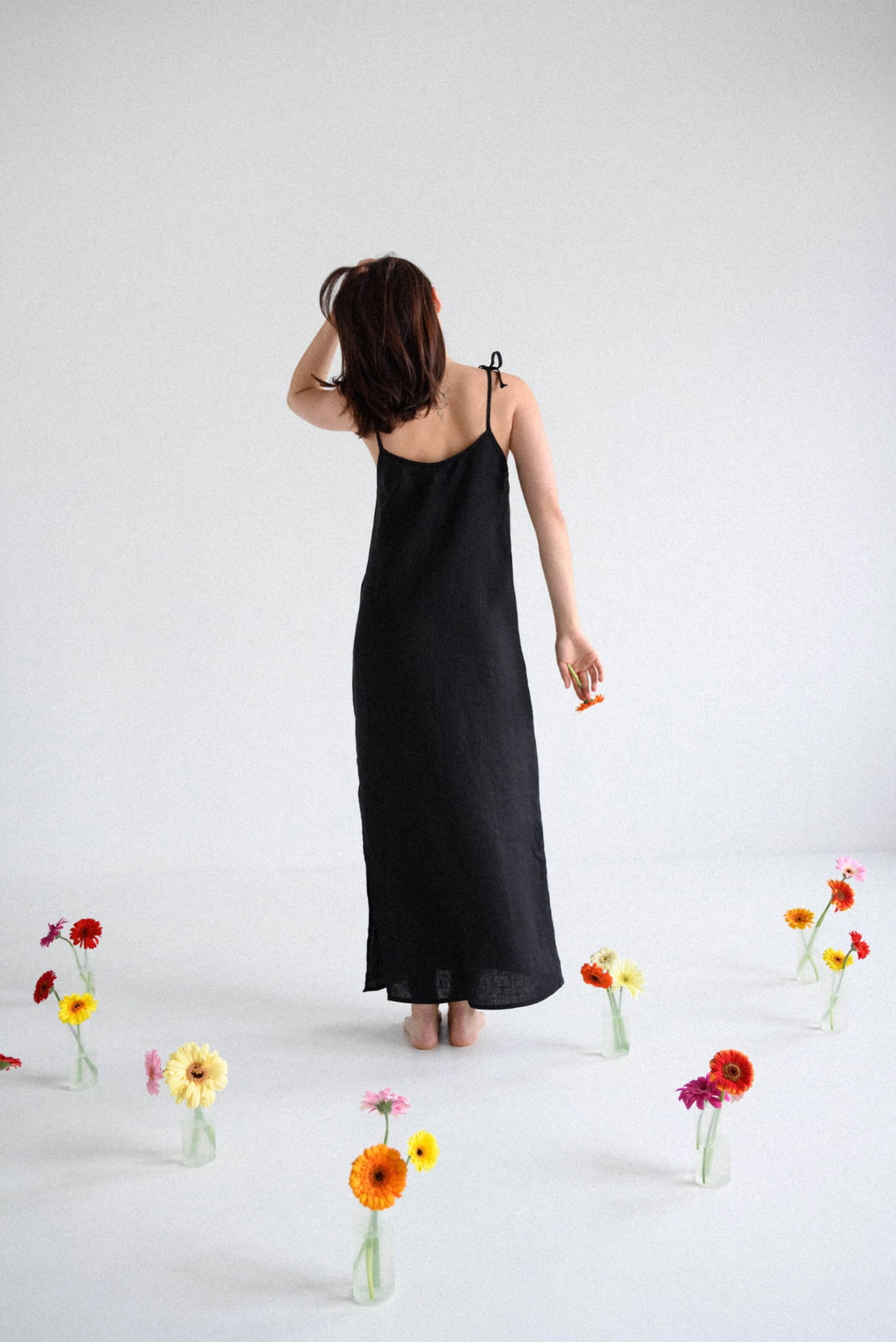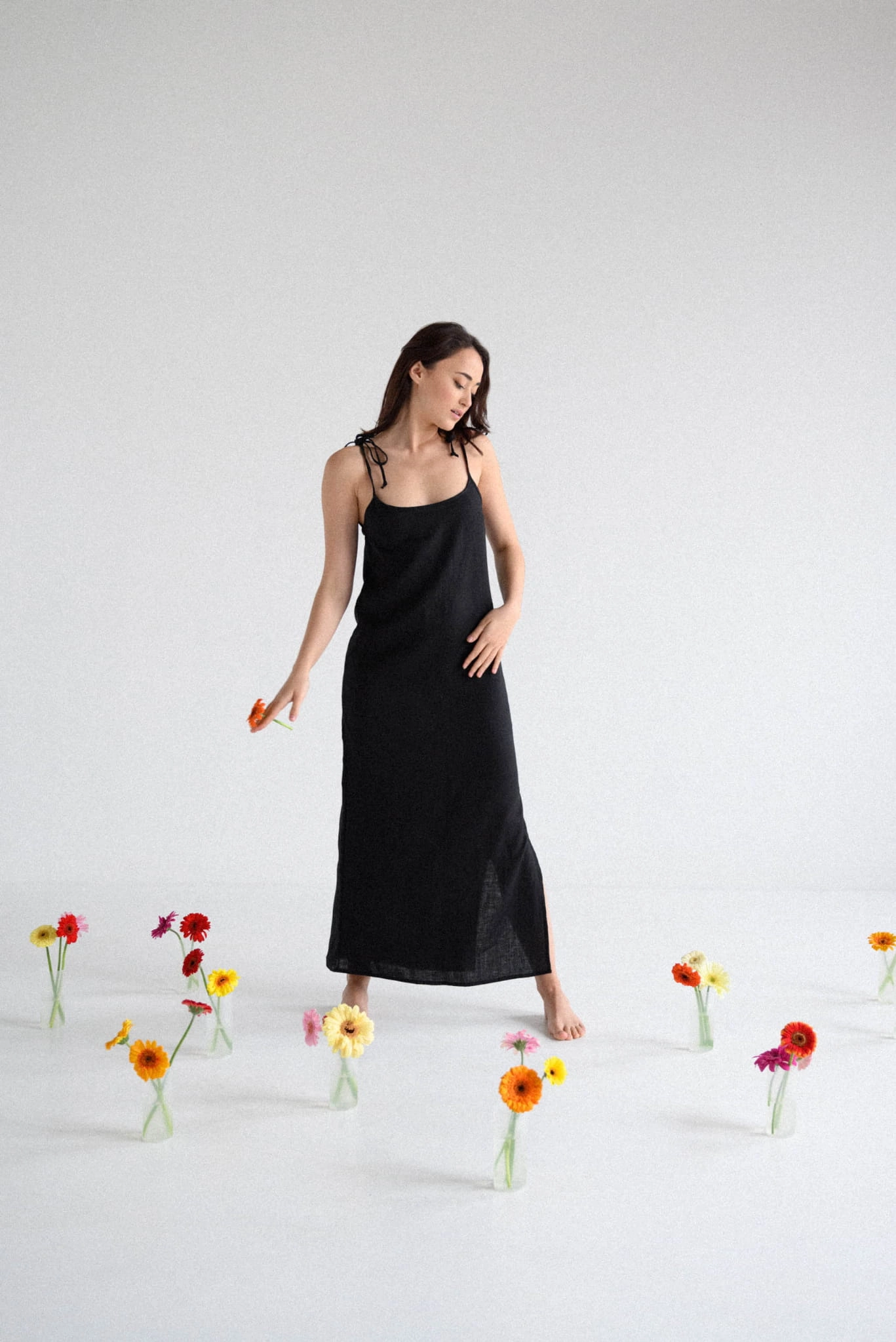 Lniana sukienka damska na ramiączkach długa CZARNA
