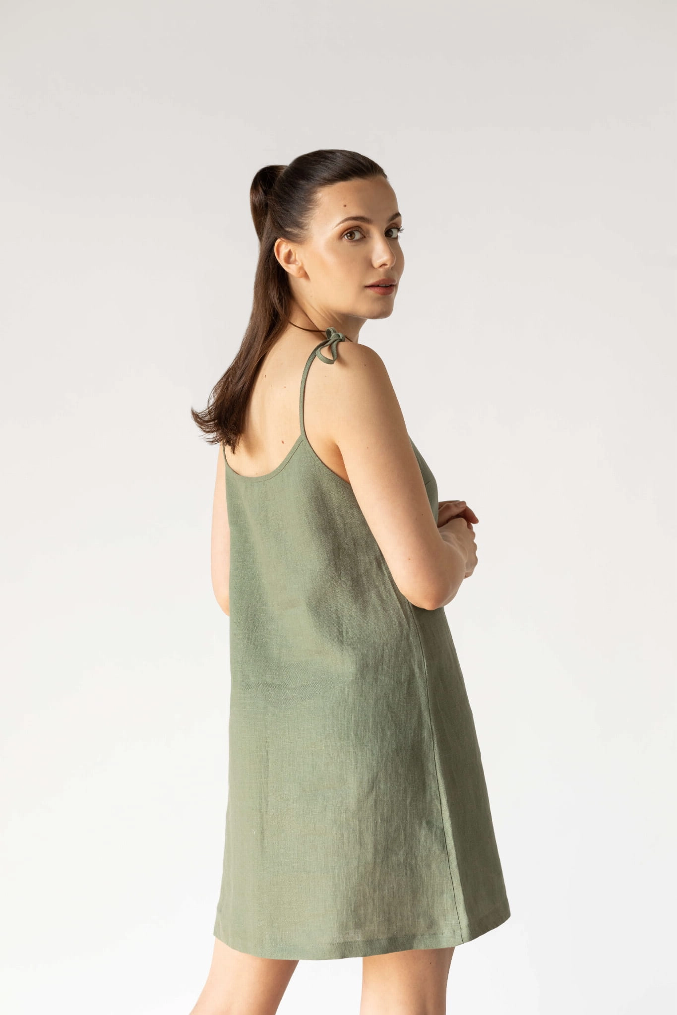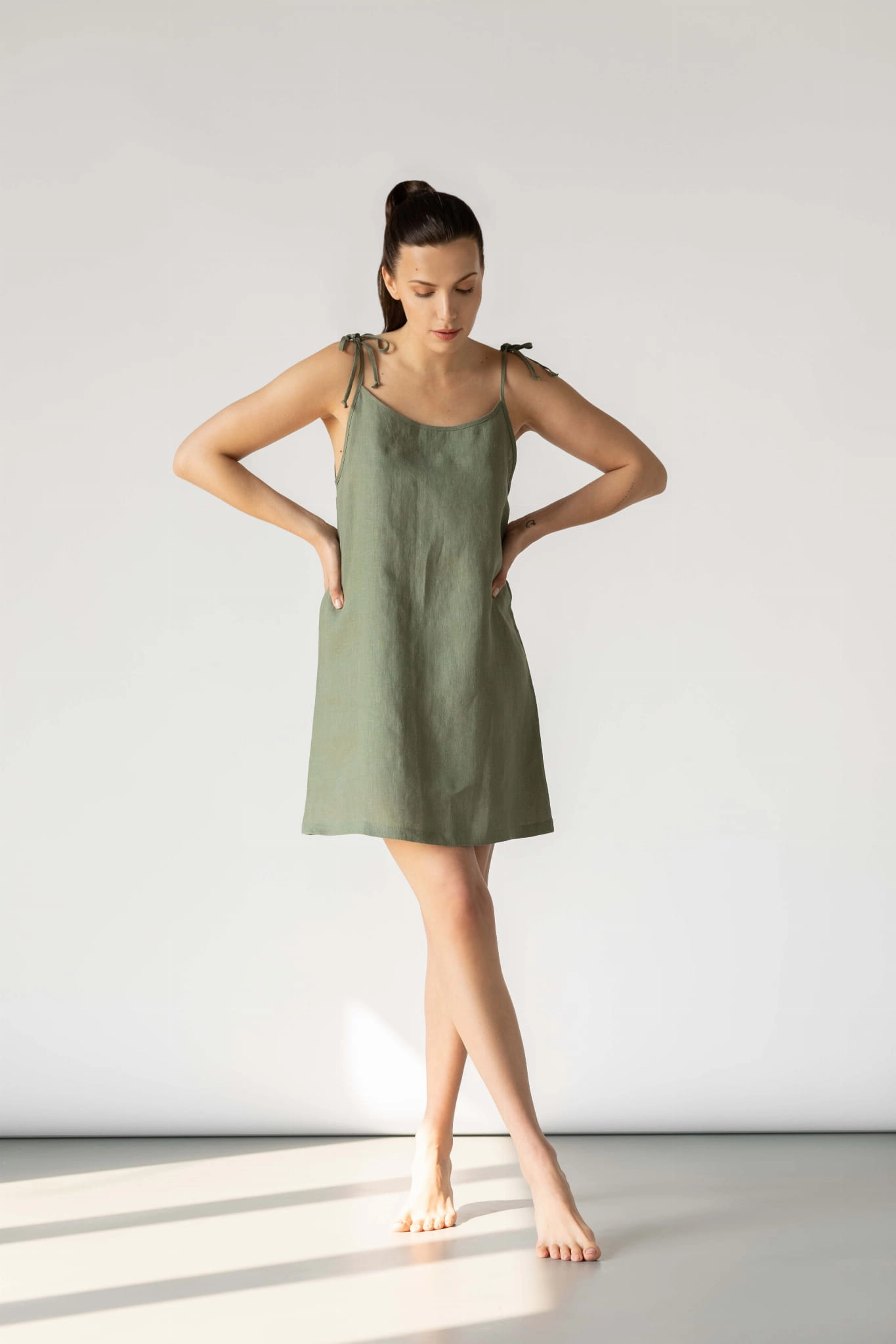 Sukienka lniana na wiązanych ramiączkach typu slip dress. Klasyczny model. Ramiączka mają około 50 cm długości. Idealna na co dzień, czy do spania. Modelka ma na sobie rozmiar S.