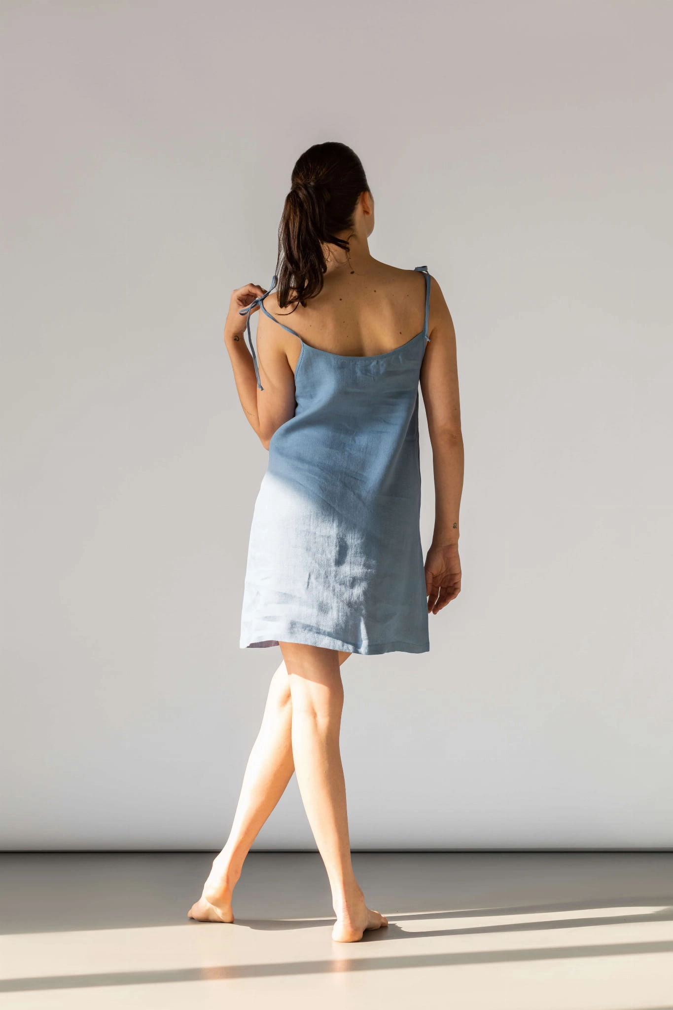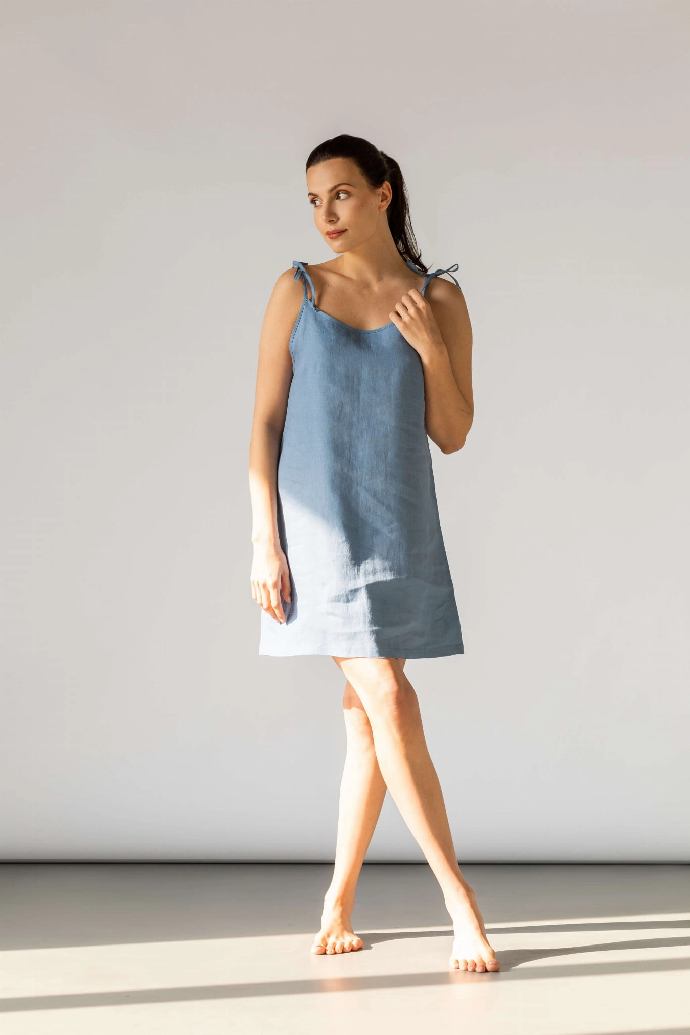 Sukienka lniana na wiązanych ramiączkach typu slip dress. Klasyczny model. Ramiączka mają około 50 cm długości. Idealna na co dzień, czy do spania. Modelka ma na sobie rozmiar S.