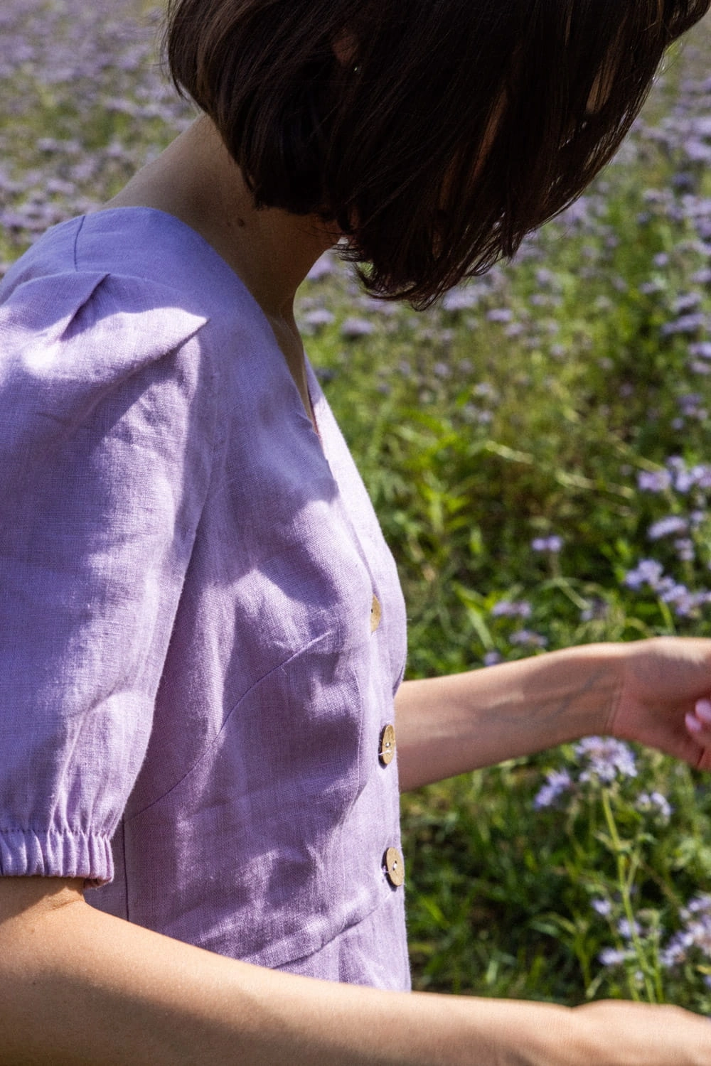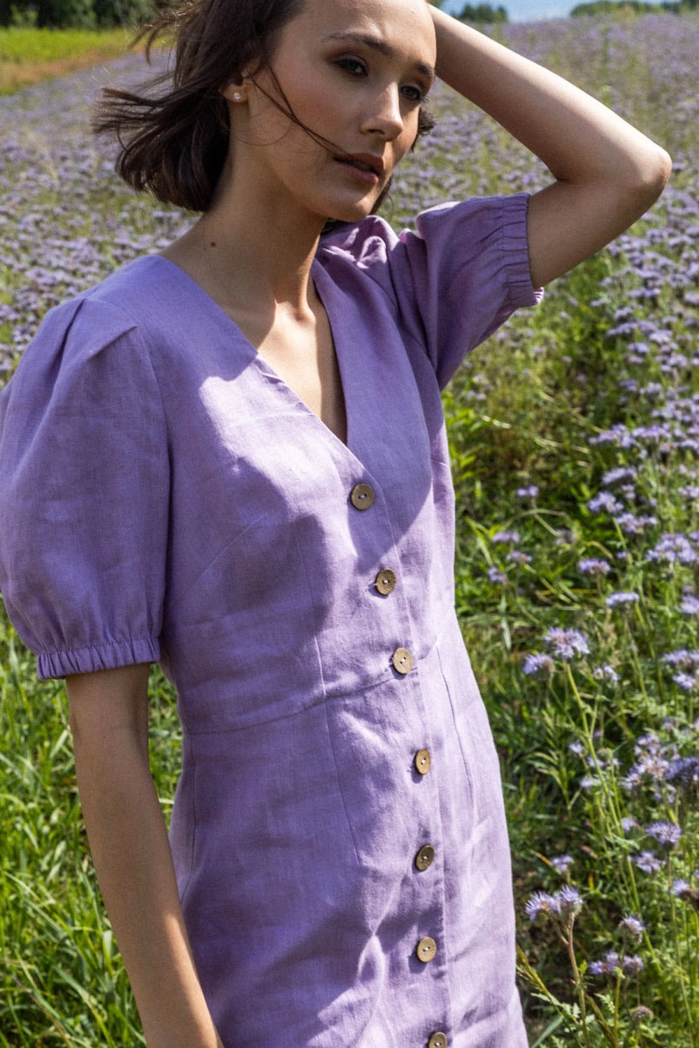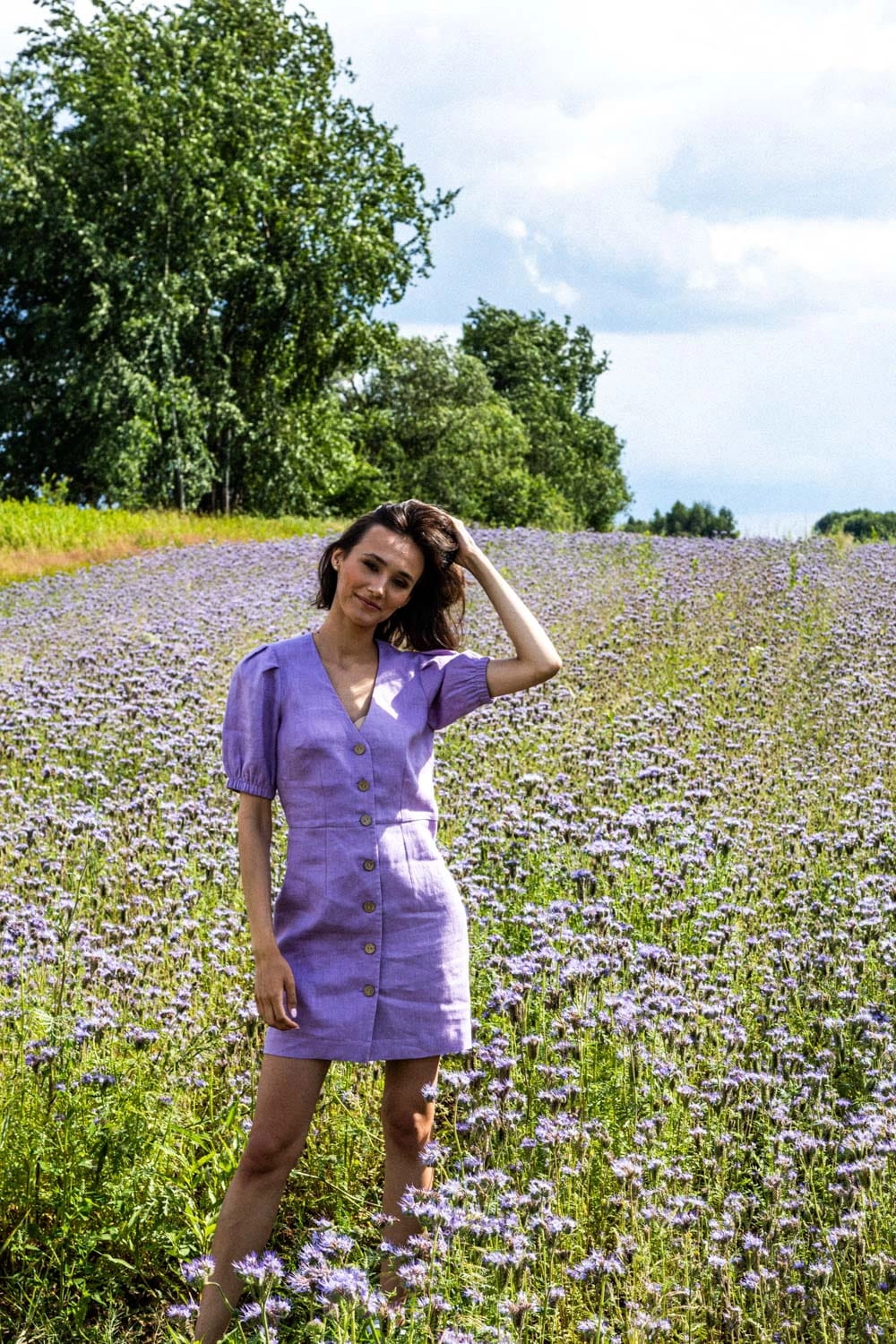 Lniana sukienka damska z krótkim rękawkiem - LAWENDA FIOLETOWA