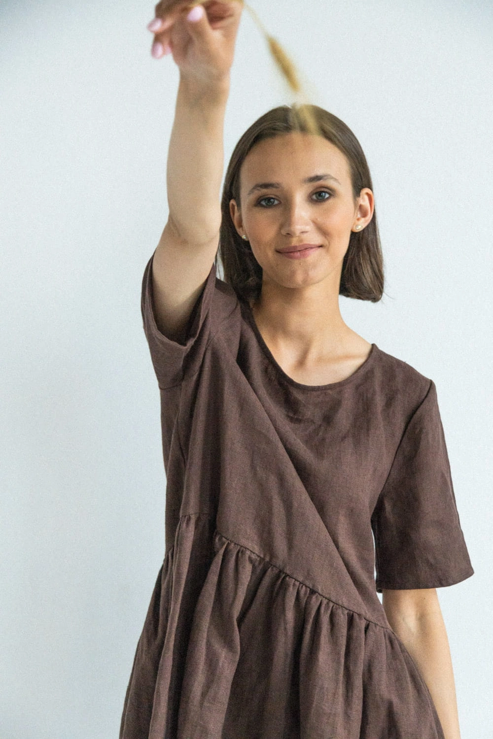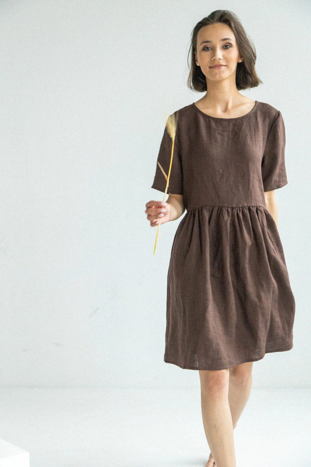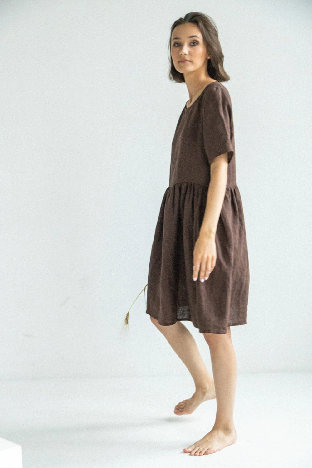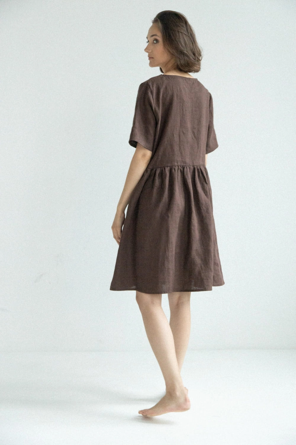 Lniana sukienka damska z krótkim rękawkiem Marzenie - Czekoladowy Brąz