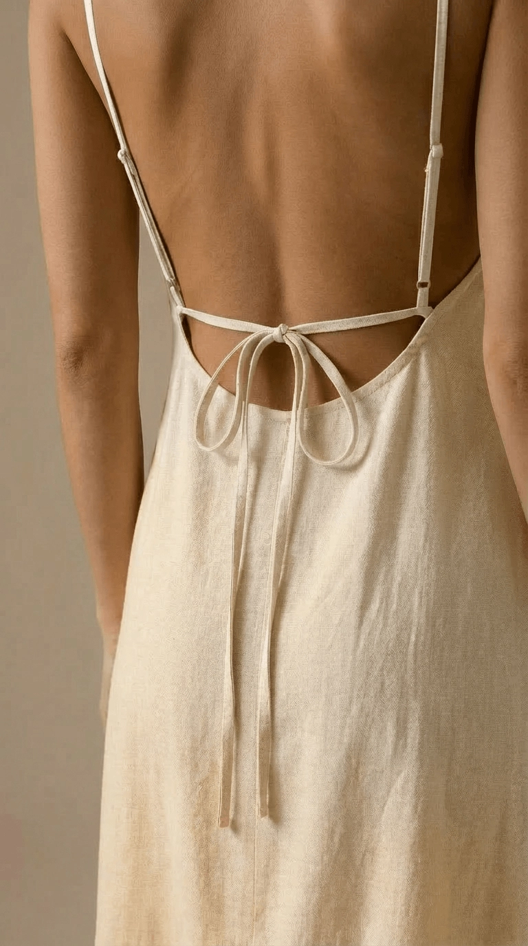 To model stworzony z myślą o wakacjach, letnich spacerach, plażowych kolacjach i codziennym noszeniu w duchu slow fashion. Minimalistyczny przód przełamuje dekoracyjne wiązanie z tyłu, dzięki czemu sukienka wygląda subtelnie, ale bardzo wyjątkowo.