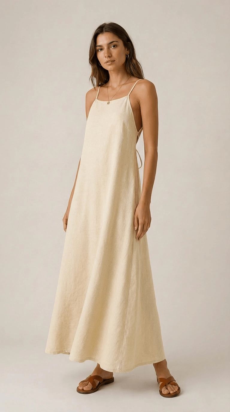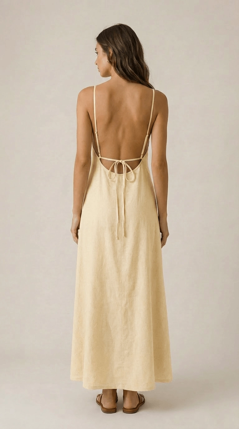 Lekka, kobieca sukienka maxi uszyta z miękkiego, mięsistego lnu w odcieniu jasny żółty, vanilia. Ma prosty, swobodny krój, cienkie regulowane ramiączka oraz efektowne odkryte plecy wiązane na troczki. Naturalna tkanina pięknie układa się na sylwetce, a jednocześnie pozostaje przewiewna i komfortowa nawet w ciepłe dni.