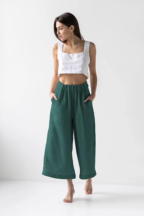 Lniane spodnie damskie kuloty - BUTELKOWA ZIELEŃ
