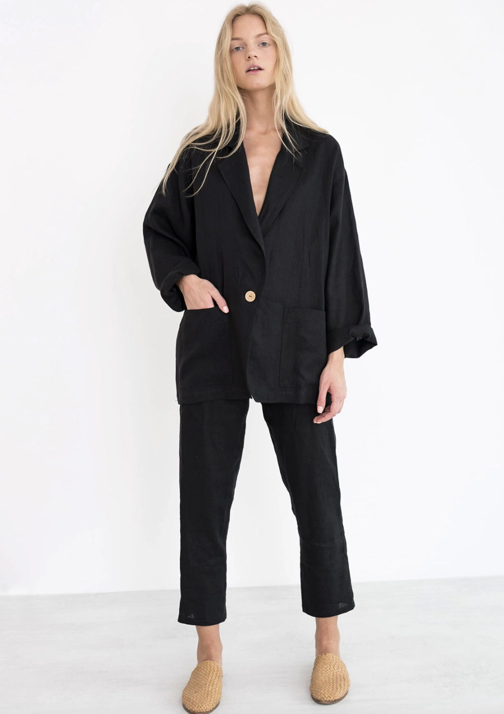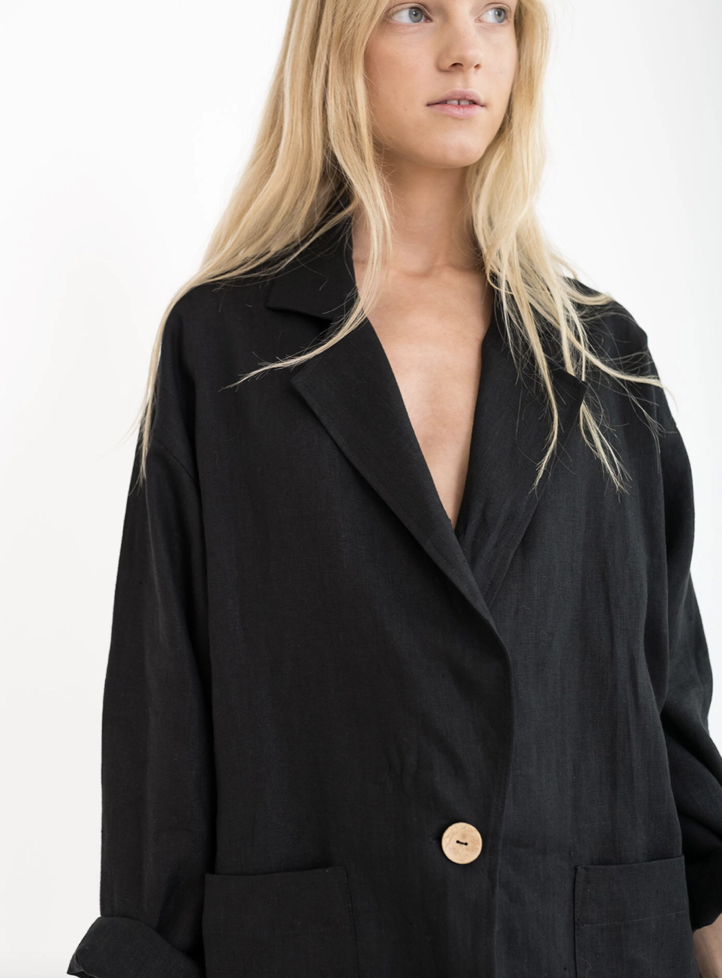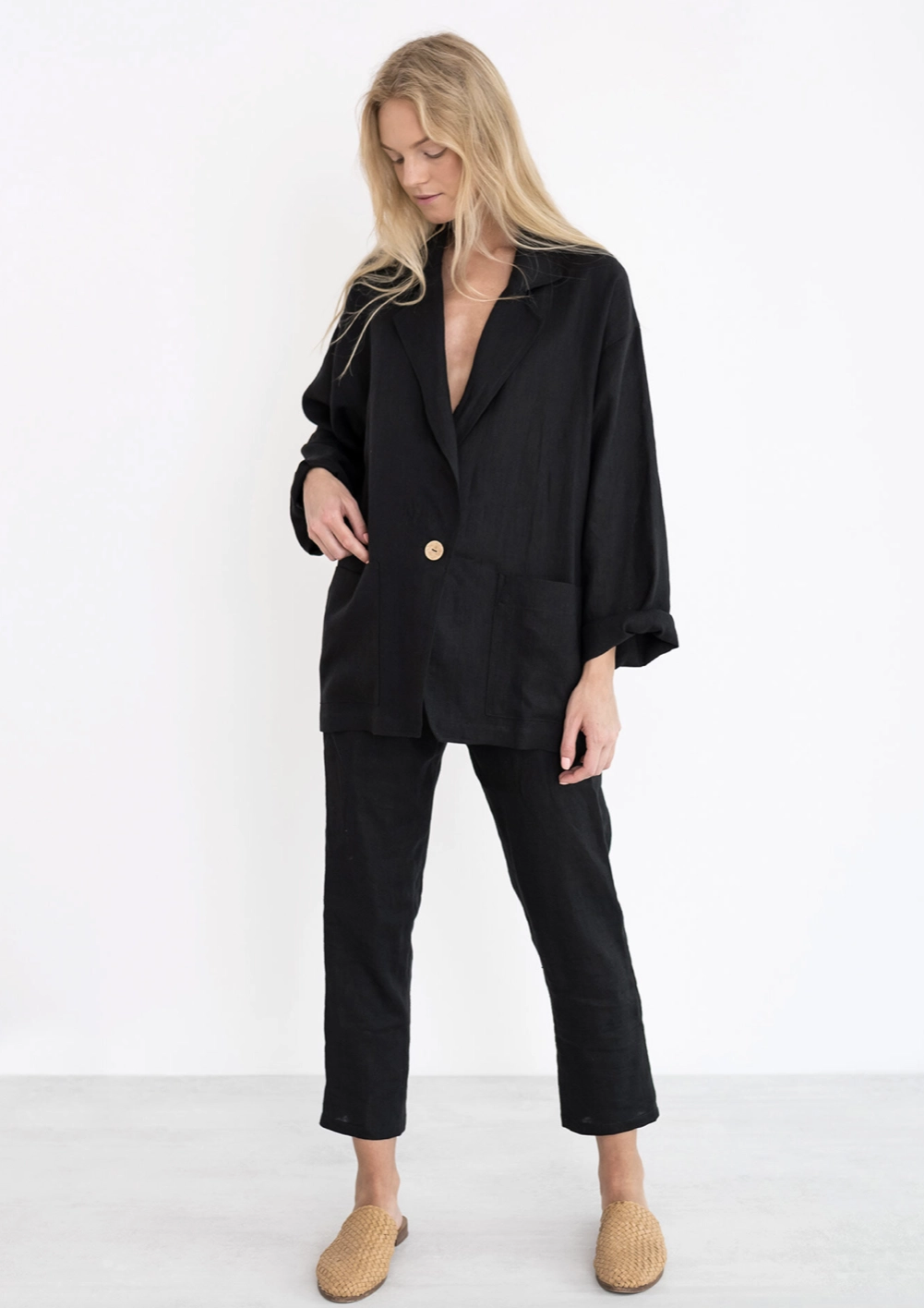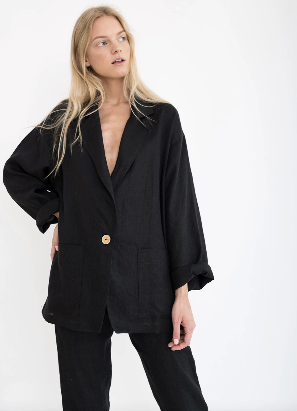 Marynarka oversize damska lniana kurtka blazer - Czarna