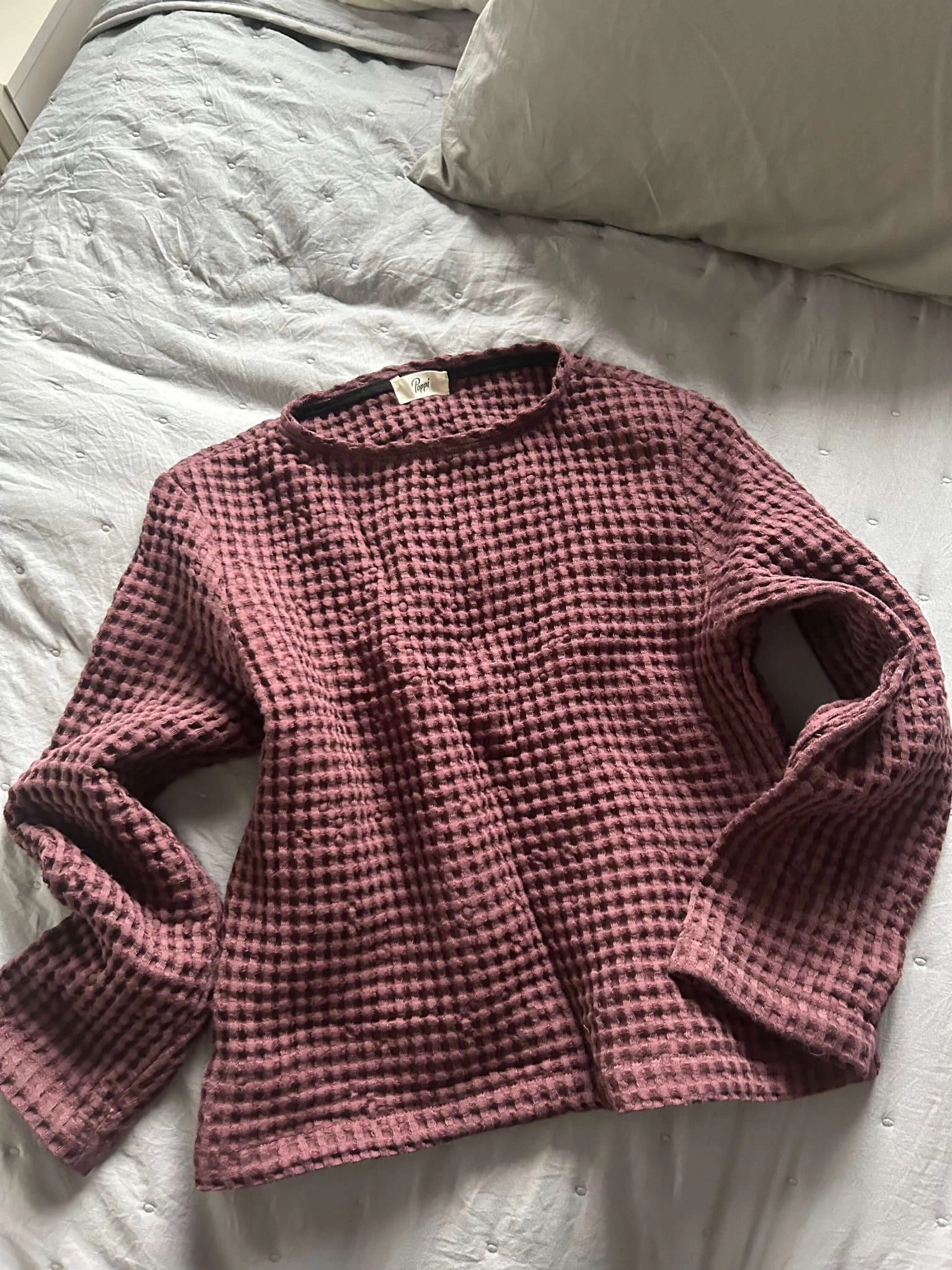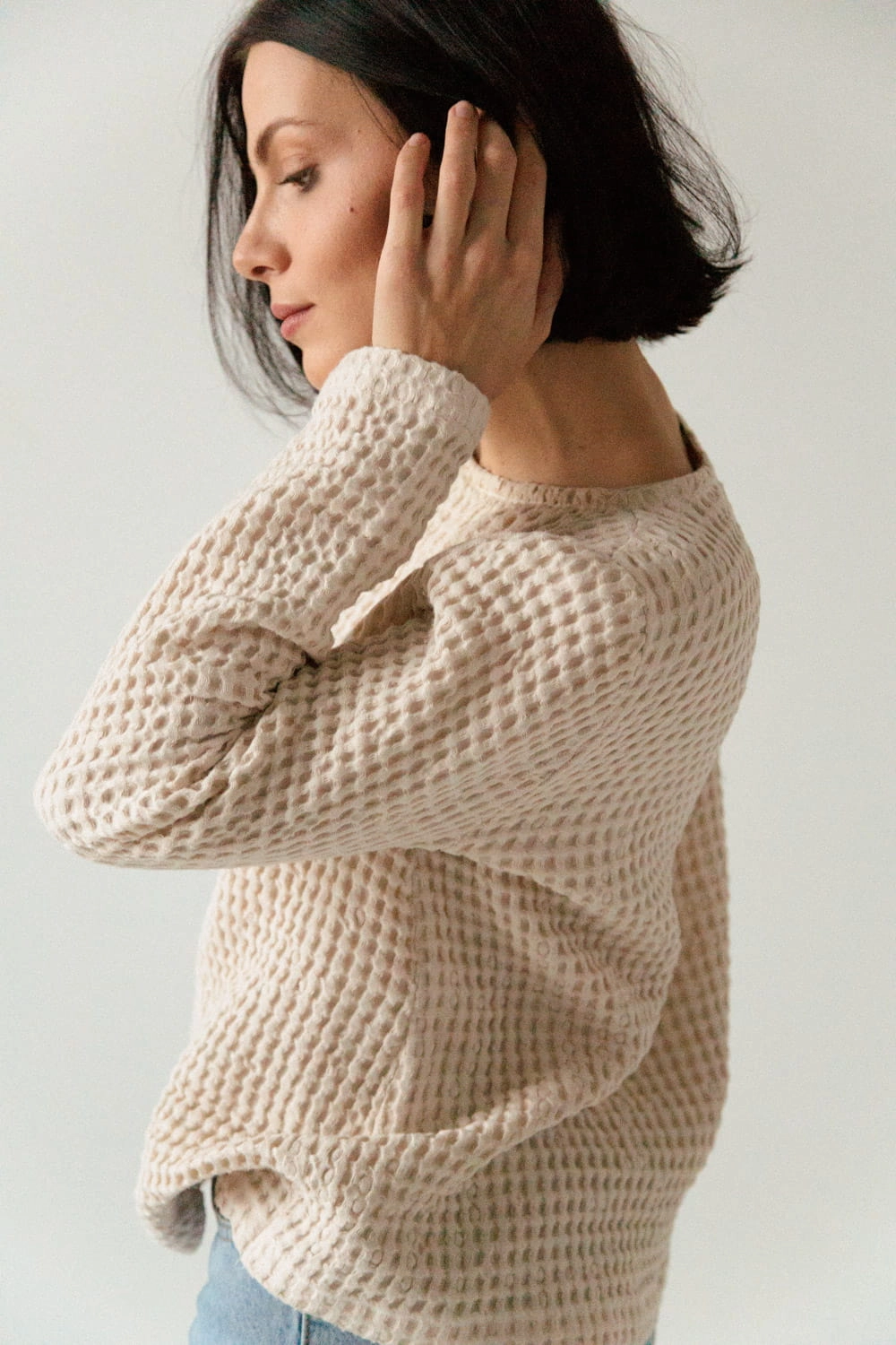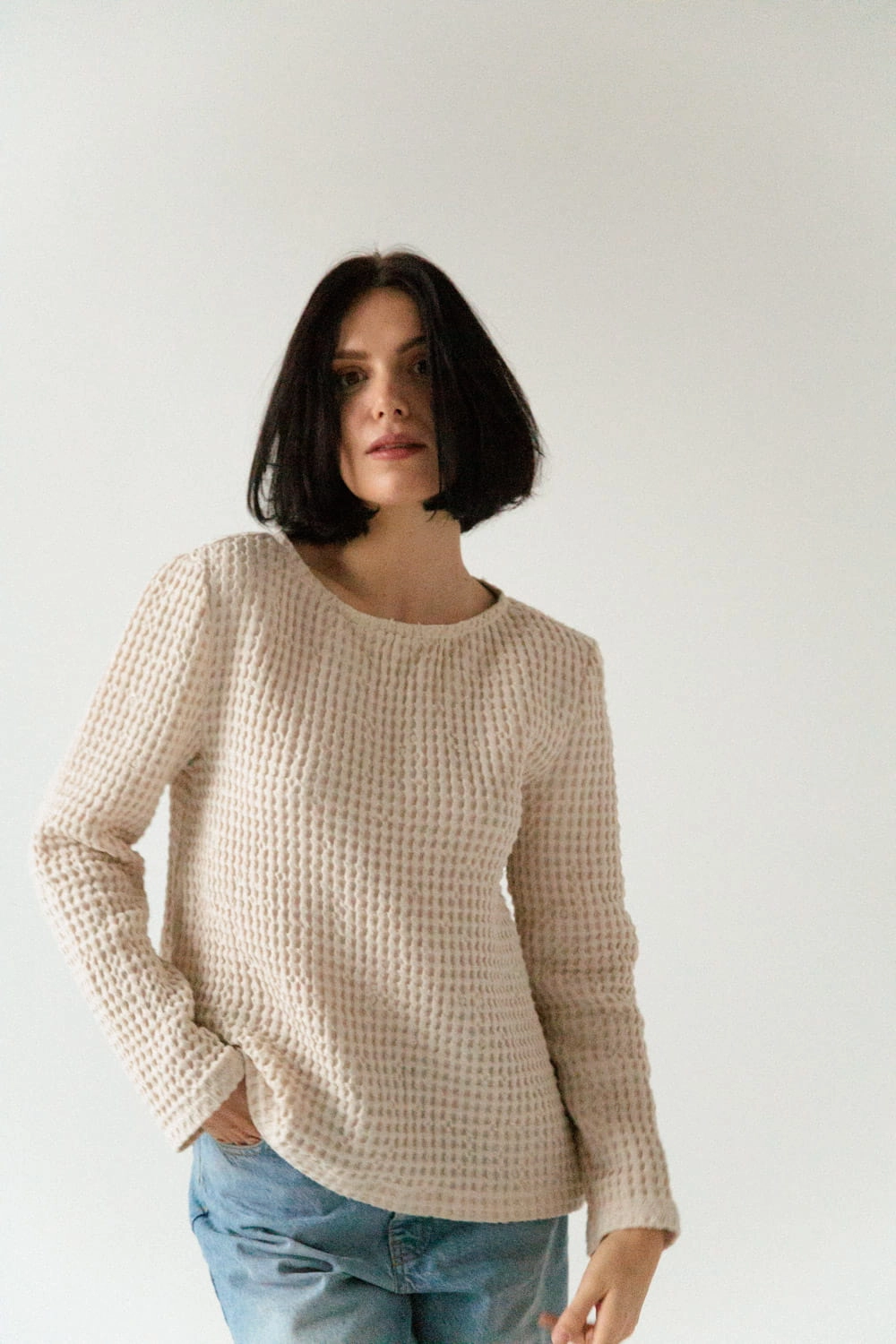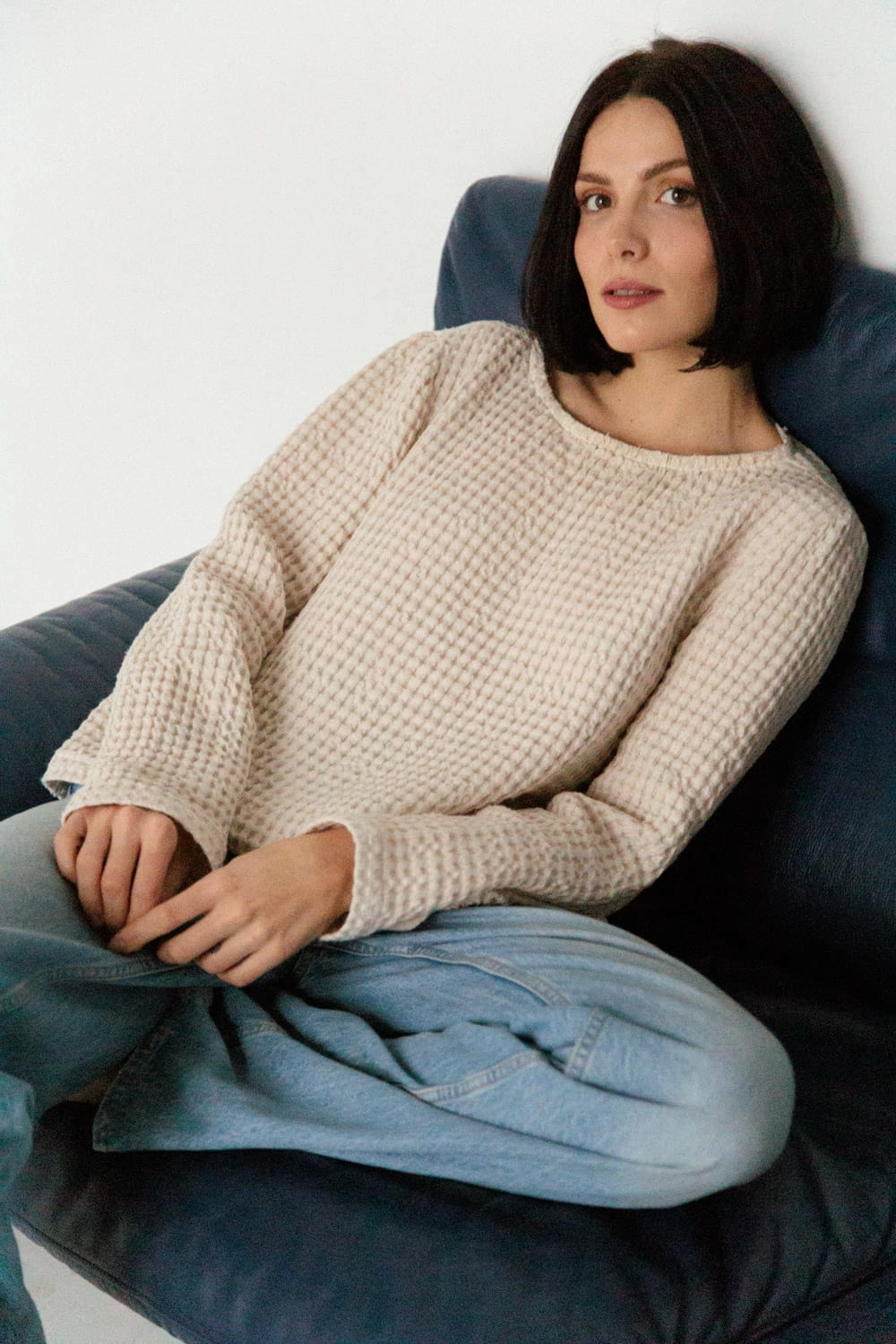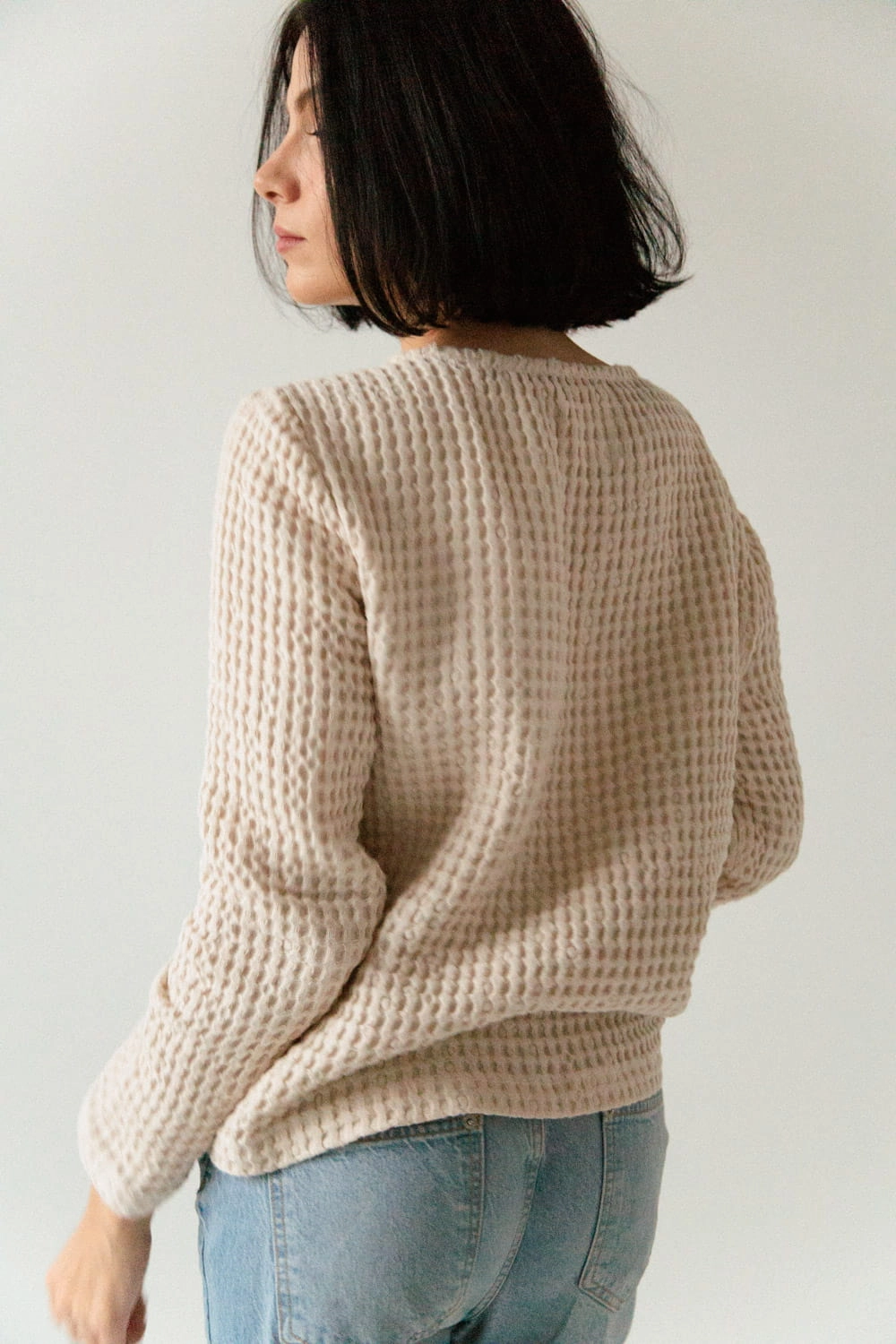 Sweter z lnianego wafelka. Jest niezwykle miękki i przyjemny w dotyku i szalenie wygodny. Z uwagi na gęstość tkaniny sweter będzie ciepło otulać w jesienne i zimowe dni.
